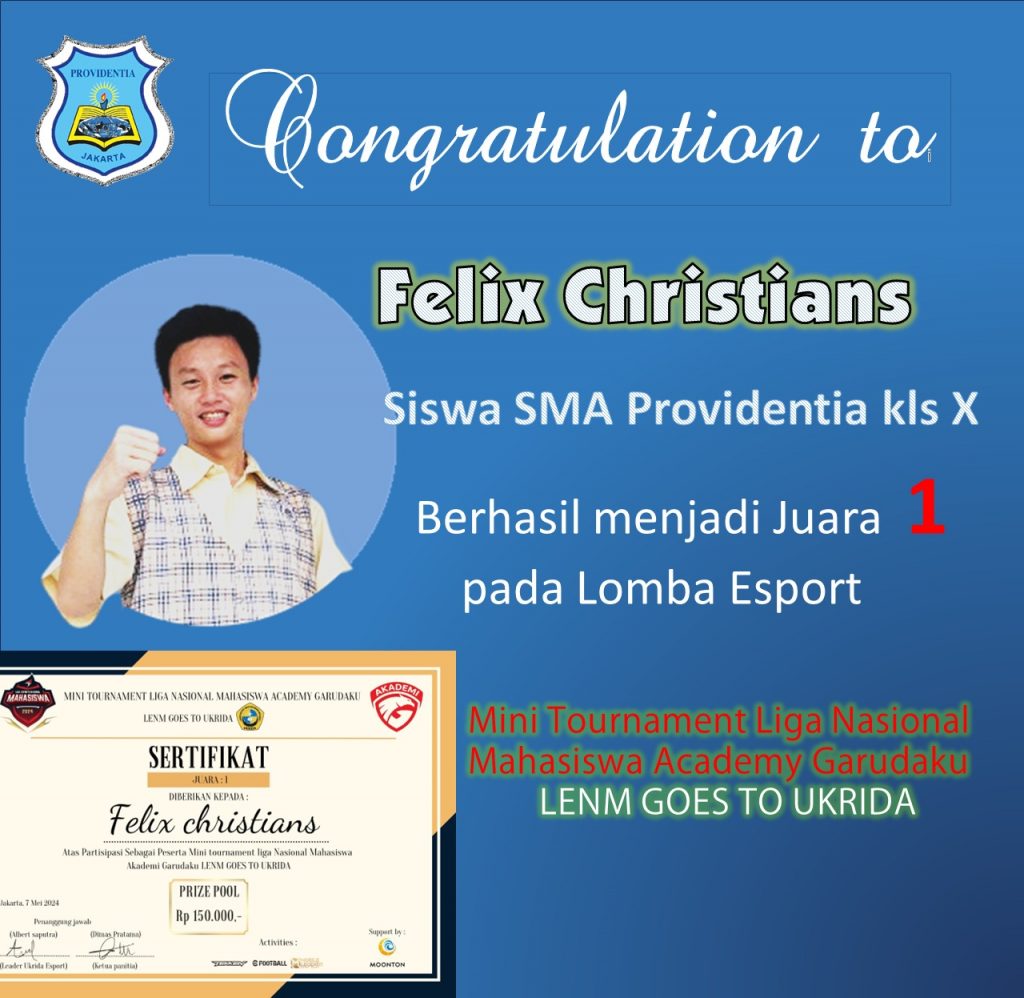 🏆 Selamat kepada Felix Christians, siswa kelas X SMA Providentia yg berhasil menjadi juara 1 lomba E-sport pada Mini Tournament Liga Nasional Mahasiswa Academy Garudaku LENM GOES TO UKRIDA.