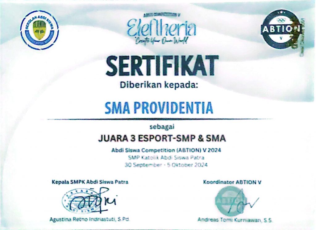 🏆 Selamat kepada tim E-sport SMA Providentia yang berhasil menjadi juara 3 lomba E-sport – SMP & SMA dalam Abdi Siswa Competition (ABTION) V 2024 yang diselenggarakan pada tanggal 30 September – 5 Oktober 2024.